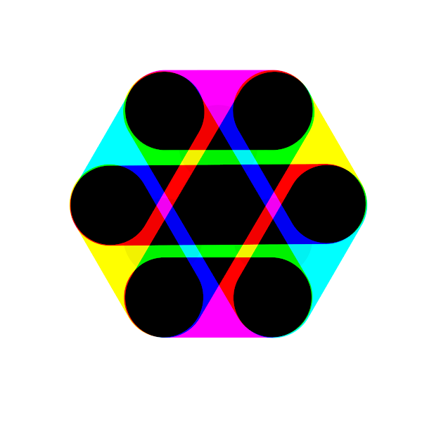 Third level Hexagon grid layered by grey dots and cyan yellow and magenta lines, producing red, green, blue and black colors.
